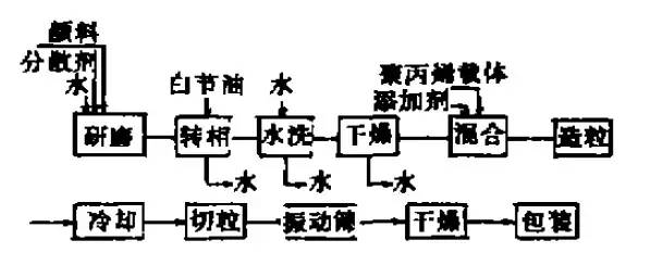4.湿法研磨(转相法):如北京燕山石化公司引进的Ciba Geigy公司专利的生产方法。该法是将颜料、聚乙烯蜡、醋酸溶液和水一同加人砾石碾磨机中研磨20小时,研磨好的物料由泵送入转相槽,在转相槽中加入 NaOH 调节PH到8并加人白节油,加热后高速搅拌,使颜料从水相转移到油相,形成尺寸为0.1~3mm的颗粒。用水冲洗颜料颗粒并进行干燥。